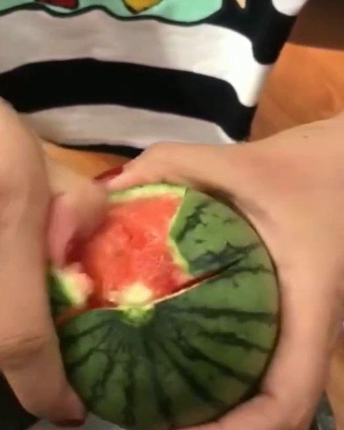 - 将西瓜翻回正面,用刀将西瓜从中间切开。