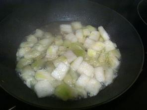 4. 炒哈米瓜:锅中留少许油,放入哈米瓜块,加入适量的盐,翻炒均匀。